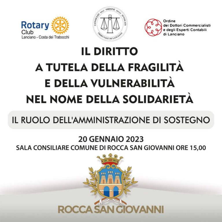 Si terrà venerdì 20 Gennaio 2023, a partire dalla ore 15, nella sala consiliare del Comune di Rocca San Giovanni, un importante Convegno dal titolo “Il Diritto a tutela della fragilità e della vulnerabilità in nome della solidarietà: il ruolo dell’Amministratore di sostegno”