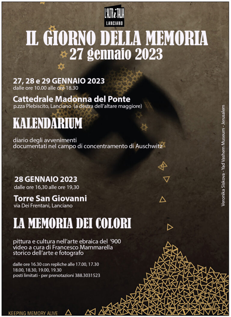 L’associazione l’Atritalia quest’anno si occuperà degli eventi della giornata della memoria. Una serie di appuntamenti per riflettere insieme che si svolgeranno nei locali della Cattedra alle Torre di San Giovanni dal 27 a 29 gennaio. i