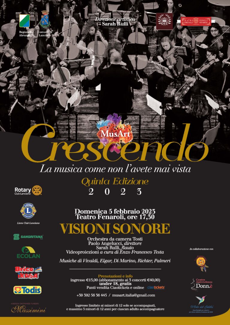 L’ Orchestra da camera Tosti diretta da Paolo Angelucci e Sarah Rulli solista al flauto apriranno la stagione con VISIONI SONORE un concerto con musiche dal classico al moderno che immergerà il pubblico in meravigliose ambientazioni create ad hoc con videoproiezioni immersive da Enzo Francesco Testa.