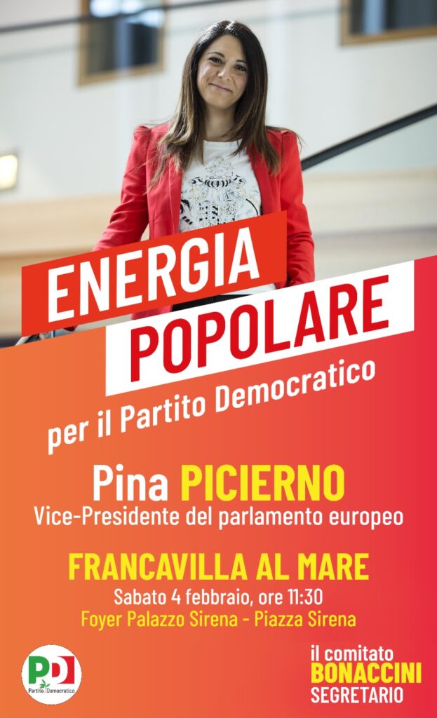 “Pina torna a Francavilla per la prima volta dopo la sua elezione-  soiegz Buttari – ma è un riferimento da sempre per la nostra città, per la Provincia di Chieti e per la Regione Abruzzo e per questo siamo ancora più contenti della sua corsa in tandem con Stefano Bonaccini in questo congresso rifondativo, che per gli iscritti, i militanti, gli elettori ha una grande rilevanza politica. Un congresso che non guarda al suo interno, ma ha l’obiettivo principale di ricostruire una grande forza democratica, riformista e progressista, di cui ha bisogno l’intero paese”.