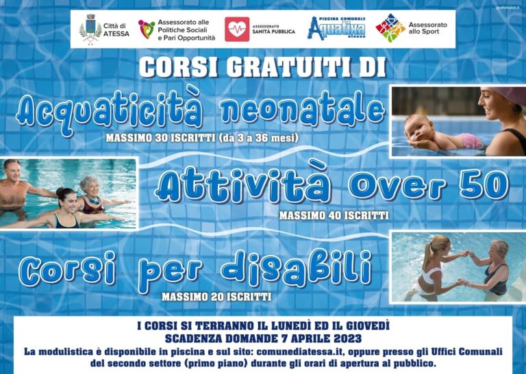 Dopo i corsi gratuiti per educazione digitale agli over 60, ginnastica e majorettes per i ragazzi, l’Amministrazione Comunale di Atessa offre la possibilità di frequentare corsi di nuoto gratuiti, organizzati presso la piscina comunale, per le seguenti categorie: