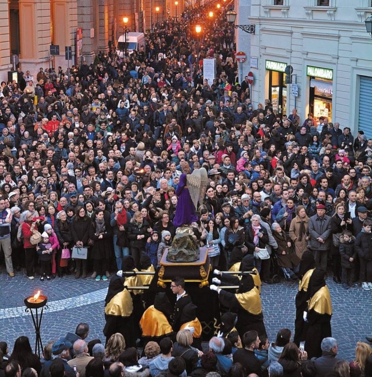 Il Venerdì Santo torna a vestirsi di cristianità e tradizione in occasione della storica processione teatina. Un’assenza durata due anni a causa delle limitazioni dovute all’emergenza sanitaria e la sensazione di poter finalmente abbracciarsi, nel rispetto della normativa in materia di pubblica sicurezza, tra le contrade di Chieti: tre chilometri da vivere nel centro cittadino, con oltre 1.115 musicisti, confratelli, cantori accompagnati da fedeli e visitatori, aprono dunque la celebrazione del 7 aprile presso la Cattedrale di San Giustino.