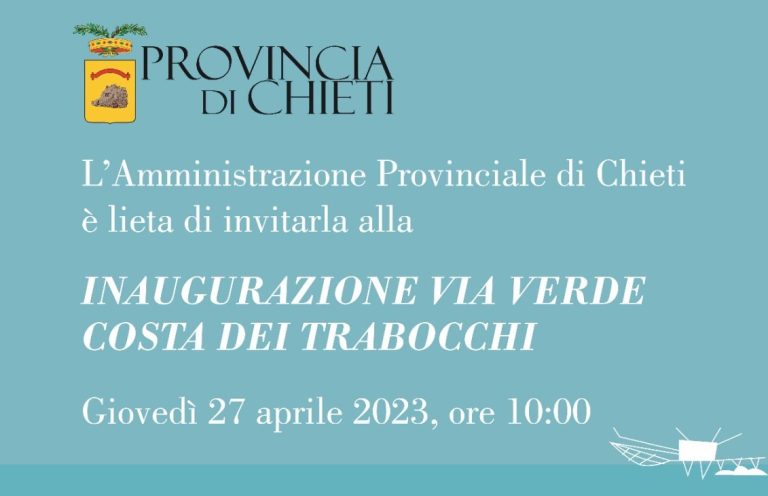 “La Via Verde Costa dei Trabocchi sarà consegnata alla comunità abruzzese. L’importante infrastruttura a mobilità lenta e sostenibile della Provincia di Chieti che in questi giorni è stata osservata speciale per le attività di collaudo con il sopralluogo finale, sarà inaugurata il 27 aprile con una grande giornata di festa. All’inaugurazione saranno presenti anche tanti giovani ai quali consegneremo idealmente questa grande opera che valorizzerà e proteggerà un territorio unico nel suo genere”. Lo annuncia il Presidente della Provincia di Chieti, Francesco Menna.