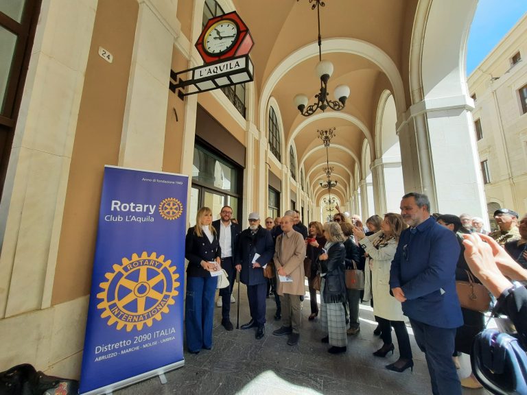 Lo storico orologio Omega installato sotto i Portici di Corso Vittorio Emanuele è tornato a scandire il tempo dopo un sapiente lavoro di restauro finanziato interamente dal Rotary Club L’Aquila. La riparazione del grande Orologio divenuto uno dei simboli del terremoto del 2009, con le lancette ferme alle ore 3 e 32, è stata eseguita dall’orologiaio aquilano Loreto Cordeschi.