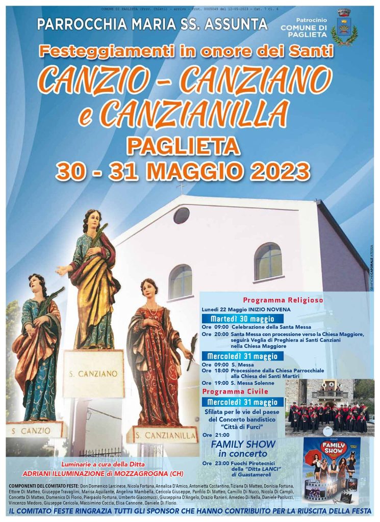 Martedì 30 maggio: ore 9:00 celebrazione della santa messa; ore 20:00 funzione religiosa con processione verso la chiesa Maggiore; veglia di preghiera ai Santi Canziani nella chiesa Maggiore.