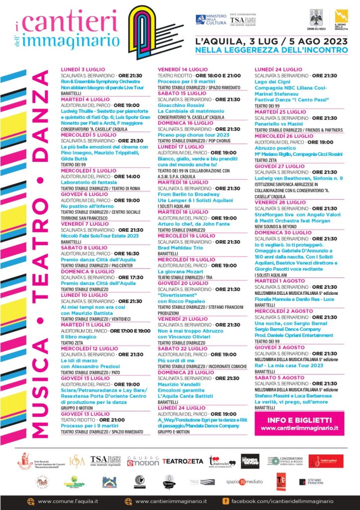 Nuova estate, nuova edizione. Torna l’attesissima la rassegna estiva del Comune dell’Aquila “I Cantieri dell’Immaginario”. Una serie di eventi, quest’anno 36, che colorano le serate cittadine e fanno divertire, ma anche riflettere, le tante persone che accorrono per l’occasione.