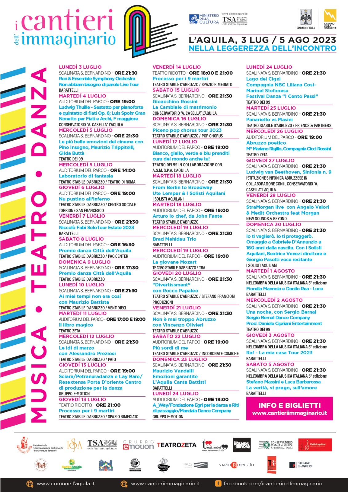 Nuova estate, nuova edizione. Torna l’attesissima la rassegna estiva del Comune dell’Aquila “I Cantieri dell’Immaginario”. Una serie di eventi, quest’anno 36, che colorano le serate cittadine e fanno divertire, ma anche riflettere, le tante persone che accorrono per l’occasione.