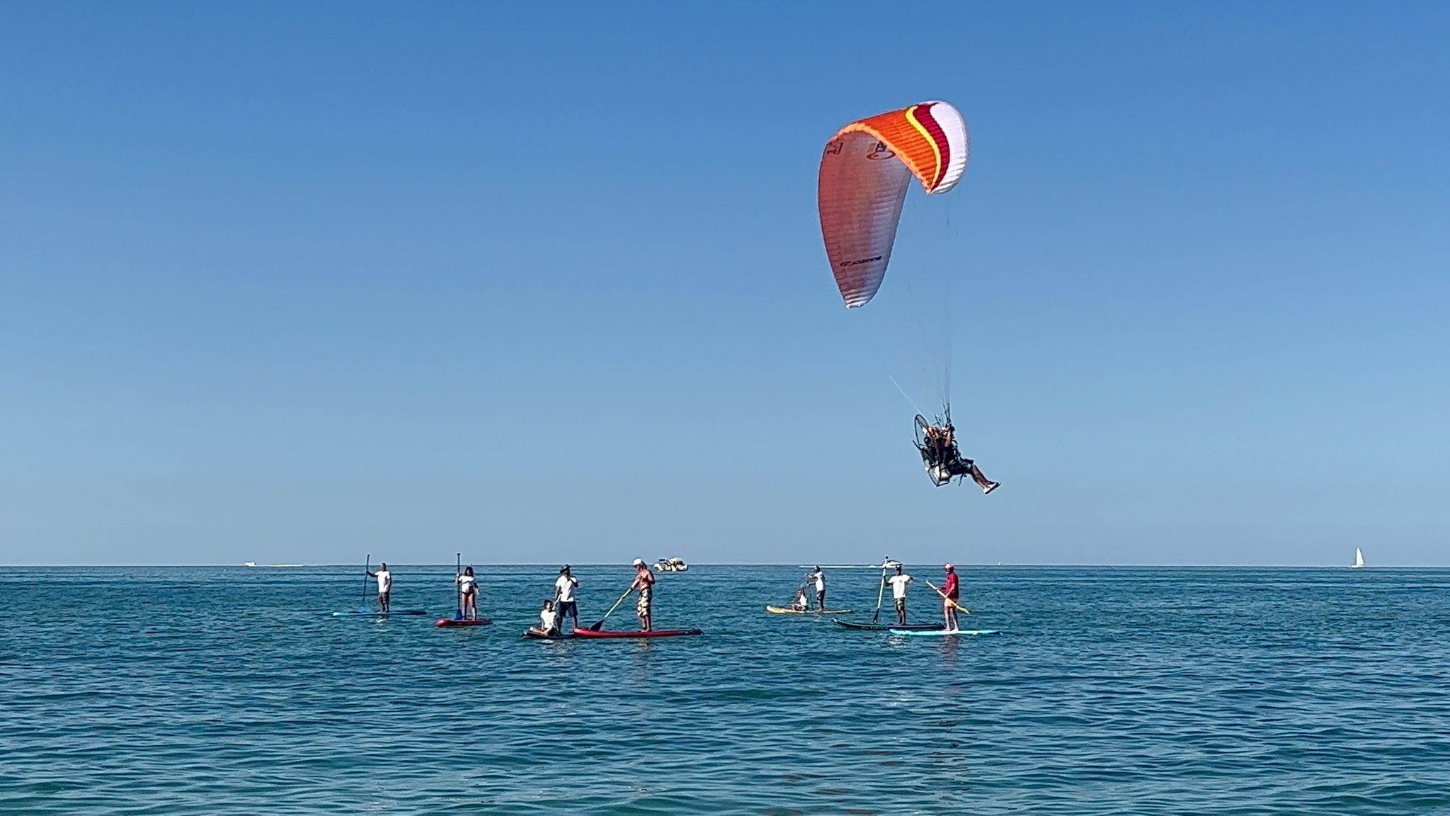 Da quell’ora, di concerto con l’organizzazione del villaggio curata dal Comune di Fossacesia, dall’Avv.Alfonso Ucci e dall’associazione MADE IN FOSSACESIA per la parte street food, si sono succeduti altri importanti momenti, uno musicale con la LIVE BAND Rose’n’Roll che ha suonato davanti lo stabilimento IN ARTE BEACH fino alle ore 17,00 e poi un momento molto emozionante verso le ore 17,30, frutto della fusione tra una decina di tavole SUP in acqua che navigavano insieme a tre PARAMOTORI in formazione in aria che hanno volteggiato sul cielo dell’evento per oltre mezz’ora per la gioia di tutti gli spettatori, avventori e curiosi che hanno potuto osservare mirabili vortici di manovre sincronizzate tra SUP e PARAMOTORI: il simbolo del villaggio è stato proprio la fusione tra CIELO TERRA E MARE con lo sfondo dello splendido territorio abruzzese.