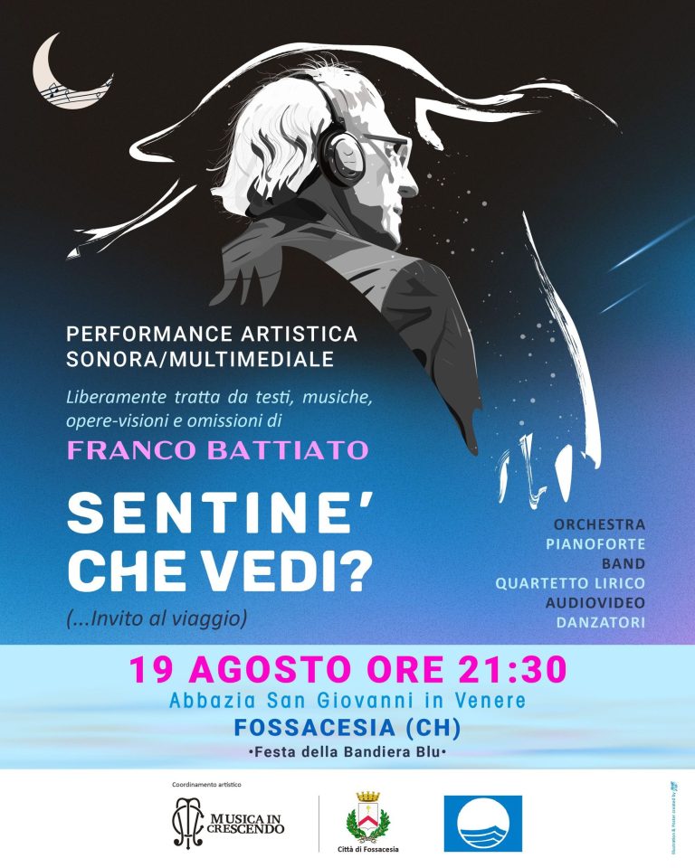 Per quest’anno l’Amministrazione Comunale di Fossacesia omaggerà la ventiduesima bandiera blu dallo splendido scenario dell’Abbazia di San Giovanni in Venere e lo farà in prima assoluta con le note, le parole, i testi, le musiche e le omissioni del grande maestro Franco Battiato.