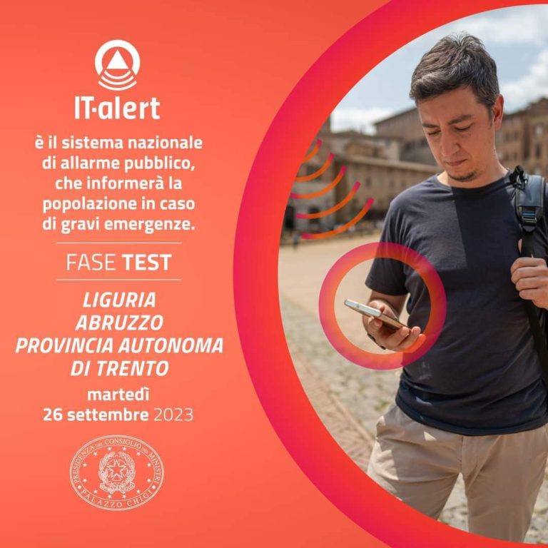Si comunica che in data 26 Settembre 2023, intorno alle ore 12:00, il Dipartimento della Protezione Civile nazionale effettuerà in Abruzzo la sperimentazione di IT-Alert, il nuovo sistema di allarme pubblico di emergenza, atto ad informare la popolazione che si trova in aree potenzialmente a rischio.