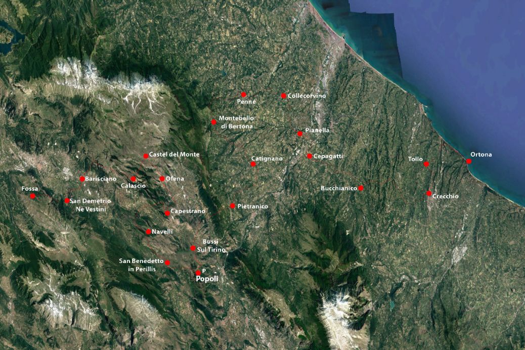 Ortona, Tollo, Crecchio, Bucchianico, Cepagatti, Pianella, Collecorvino, Penne, Montebello di Bertona, Catignano, Pietranico, Bussi sul Tirino, Popoli, San Benedetto in Perillis, Navelli, Capestrano, Ofena, Castel del Monte, Calascio, Barisciano, San Demetrio né Vestini e Fossa.