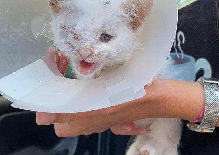 Come accade alla gran parte dei gattini soccorsi per strada, entrambi gli occhi erano compromessi dalla rinotracheite che quando non viene curata, porta alla cecità. Con un occhietto fuori dall’orbita, il gattino è stato ricoverato e, una volta stabilizzato, è stato sottoposto ad un intervento di enucleazione.