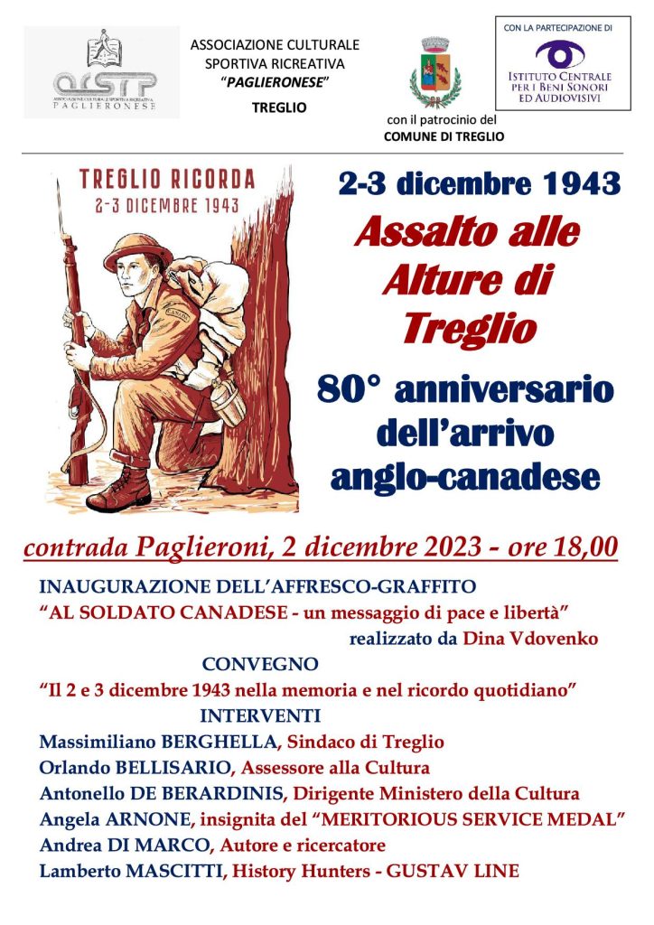 “Un attacco da parte della 38esima Brigata Irlandese – spiega l’assessore alla cultura e vice sindaco Orlando Bellisario che è pure autore di ricerche storiche sul territorio nonché presidente onorario dell’associazione Paglieronese – dell’esercito britannico e della prima divisione canadese e dei successivi lunghi mesi in cui la contrada e il paese di Treglio furono la retrovia e il luogo di riposo dei reparti canadesi impegnati nella battaglia di Ortona.