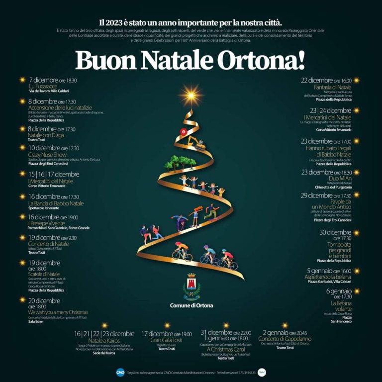Si comincia oggi con l’appuntamento della tradizione della vigilia con Lu fucaracce preparato nelle varie frazioni. Domani ci sarà l’accensione delle luminarie con animazione per i più piccoli in piazza della Repubblica, poi lungo il corso dal 15 partono i mercatini di Natale. Il 16 presepe vivente alla parrocchia di San Gabriele, il 17 “Gran Gala Tosti” al Teatro Tosti.