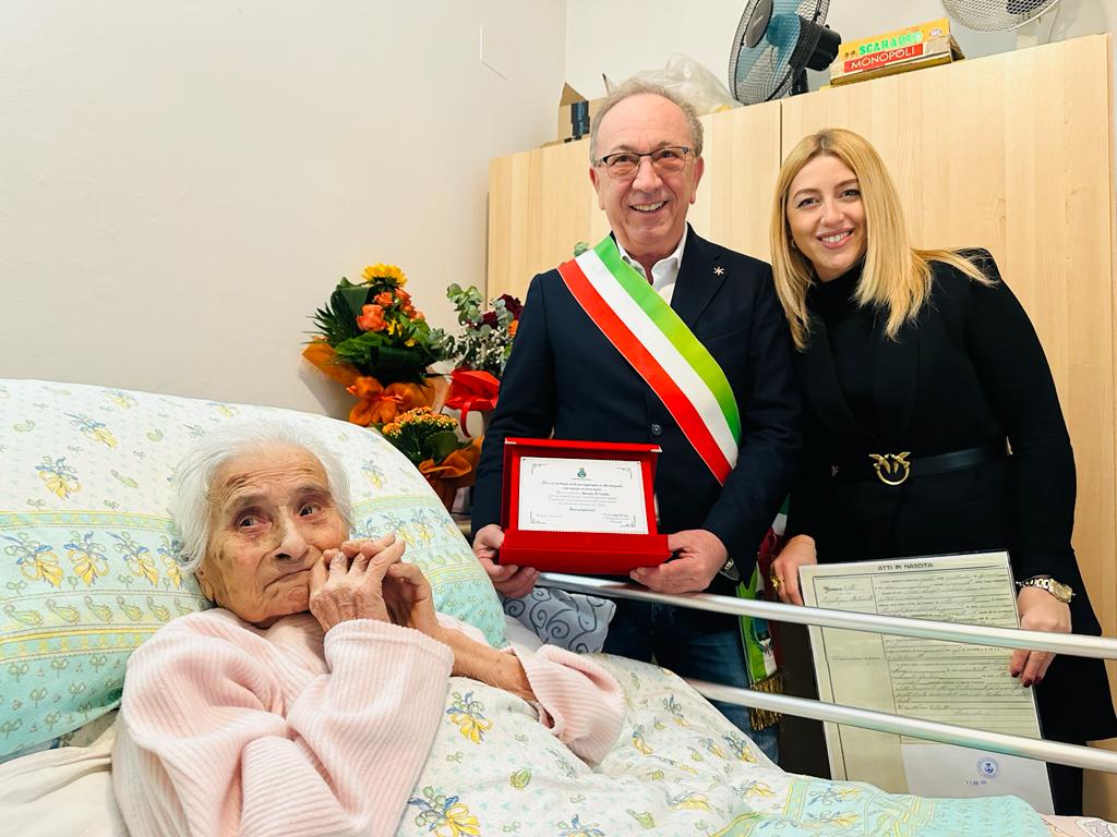 Anche sindaco Giorgio De Luca e il vicesindaco ed assessore alle Politiche sociali Giulia De Lellis hanno voluto portare gli auguri dell’Amministrazione comunale alla nonnina di Manoppello, consegnandole una targa ricordo, un mazzo di fiori e la copia anastatica del suo Atto Nascita.