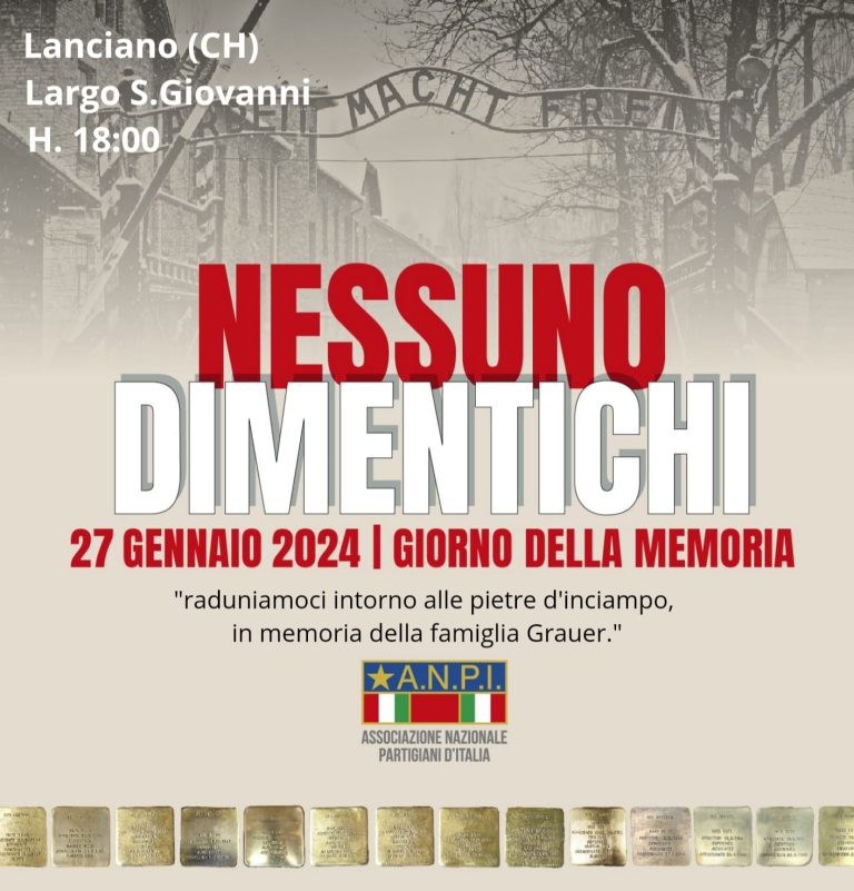 L’Anpi di Lanciano nel giorno della Memoria ha scelto di ritrovarsi a Largo San Giovanni nel quartiere di Lancianovecchia, alle ore 18.00 intorno alle pietre di inciampo in ricordo della famiglia Grauer. Confido in una numerosa partecipazione, è importante testimoniare con la propria presenza l’impegno e la volontà di difendere i valori della libertà e della democrazia affinché orrori come questo non si ripetano. Dobbiamo combattere per la pace. Ricordare la Shoah significa anche riflettere su quanto accade oggi per scongiurare eventuali drammatici scenari”.