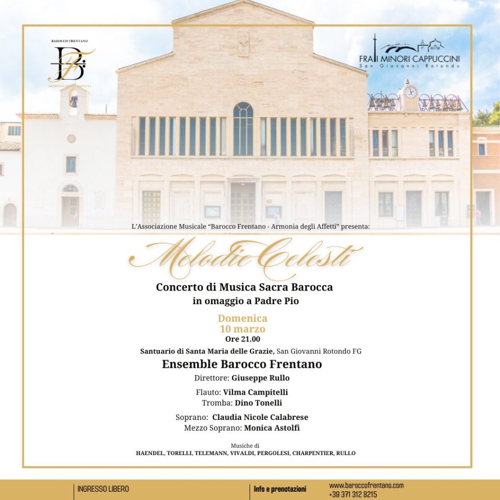 Un concerto unico nel suo genere, dedicato a Padre Pio e dalle profonde radici spirituali. Si chiama “Melodie Celesti” l’evento musicale che domenica 10 marzo alle 21 vedrà esibire il Barocco Frentano nel santuario di Santa Maria delle Grazie di San Giovanni Rotondo.