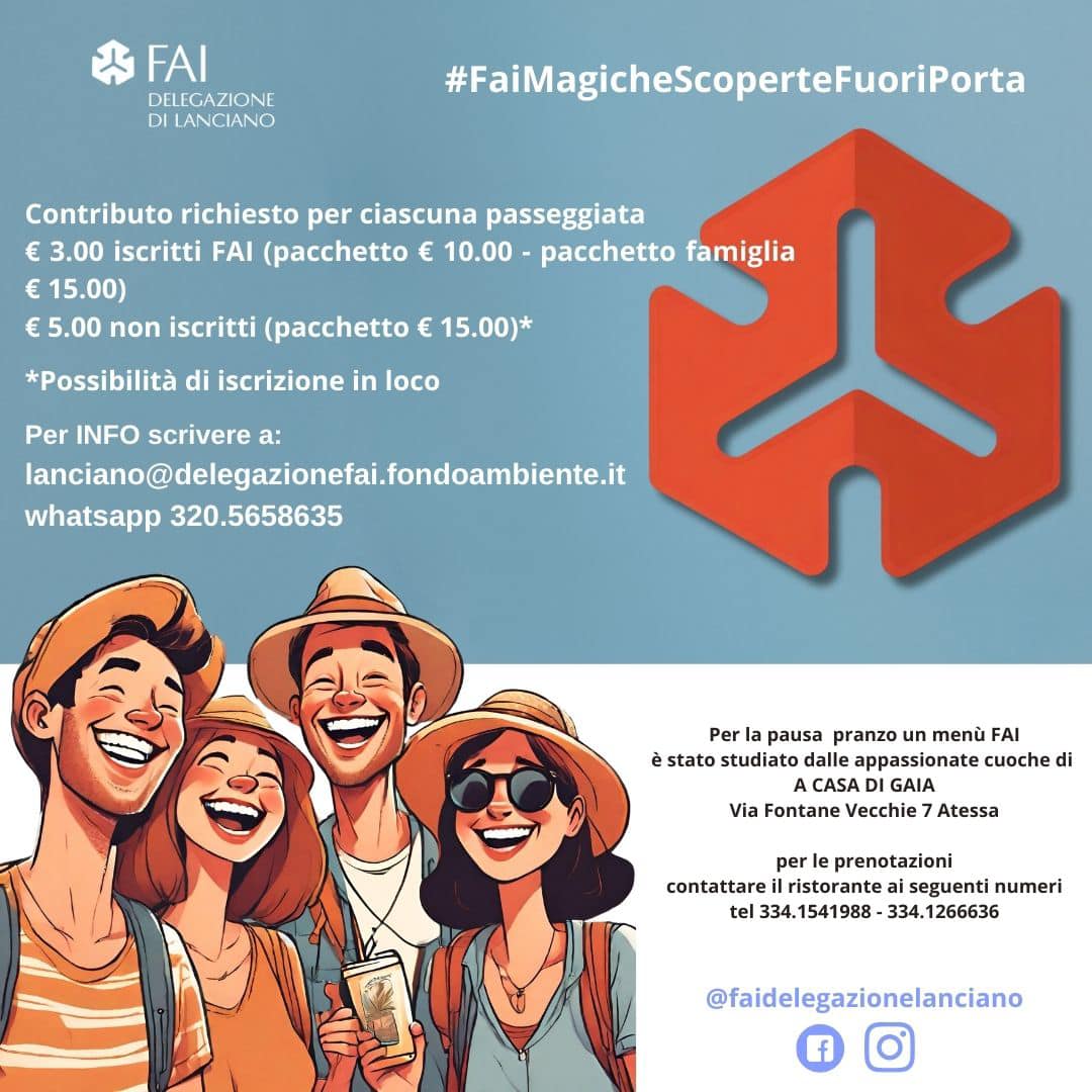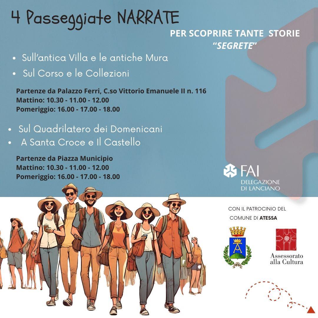 Domenica 7 aprile gli Apprendisti Ciceroni della delegazione Fai di Lanciano accompagneranno i visitatori ed i turisti in quattro percorsi alla scoperta della città di Atessa tra leggende, devozione e arte. Il nome dell’iniziativa culturale è “Esplorando Atessa” ed ha un costo di tre euro per gli iscritti al Fai (con possibilità di tesseramento in loco) e di cinque per i non tesserati.
