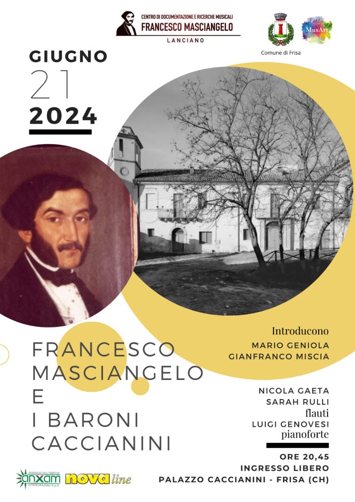 Il 21 giugno, alle 20,45, presso la Sala Consiliare del Comune di Frisa (Palazzo Caccianini) si terrà il seminario – concerto “Francesco Masciangelo e i baroni Caccianini di Frisa. Un salotto musicale abruzzese dell’Ottocento”, che mette al centro le vicende musicali del Salotto Caccianini e più in generale dei salotti frentani che videro protagonista Francesco Masciangelo.