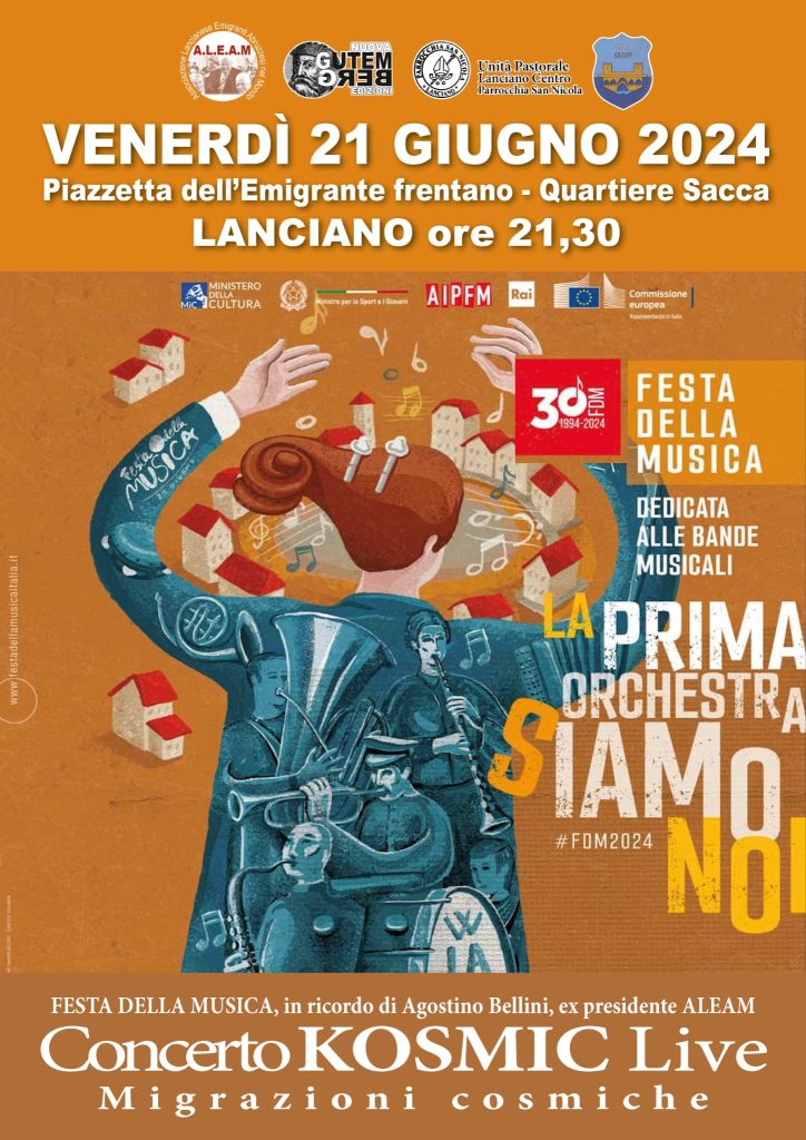 L’obiettivo principale di questa manifestazione è valorizzare, attraverso la musica, la vita sociale, politica e culturale delle comunità, collegando simbolicamente gli spazi di una città con la sua storia e la sua popolazione. L’associazione Nuova Gutemberg ha accolto queste istanze organizzando un concerto il 21 giugno alle ore 21:30 nella Piazzetta dell’Emigrante, situata nel quartiere Sacca, in memoria di Agostino Bellini. Questo evento è realizzato in sinergia con l’ALEAM (Associazione Lancianese Emigrati Abruzzesi nel Mondo) e con l’Unità Pastorale Lanciano Centro, parrocchia di San Nicola.