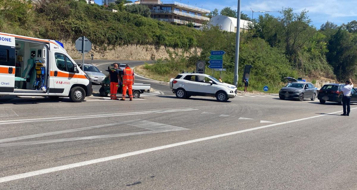 L’incidente, che ha provocato rallentamenti e disagi alla viabilità, ha coinvolto due auto e un ape car 50 cc che procedeva in direzione San Vito- Ortona.