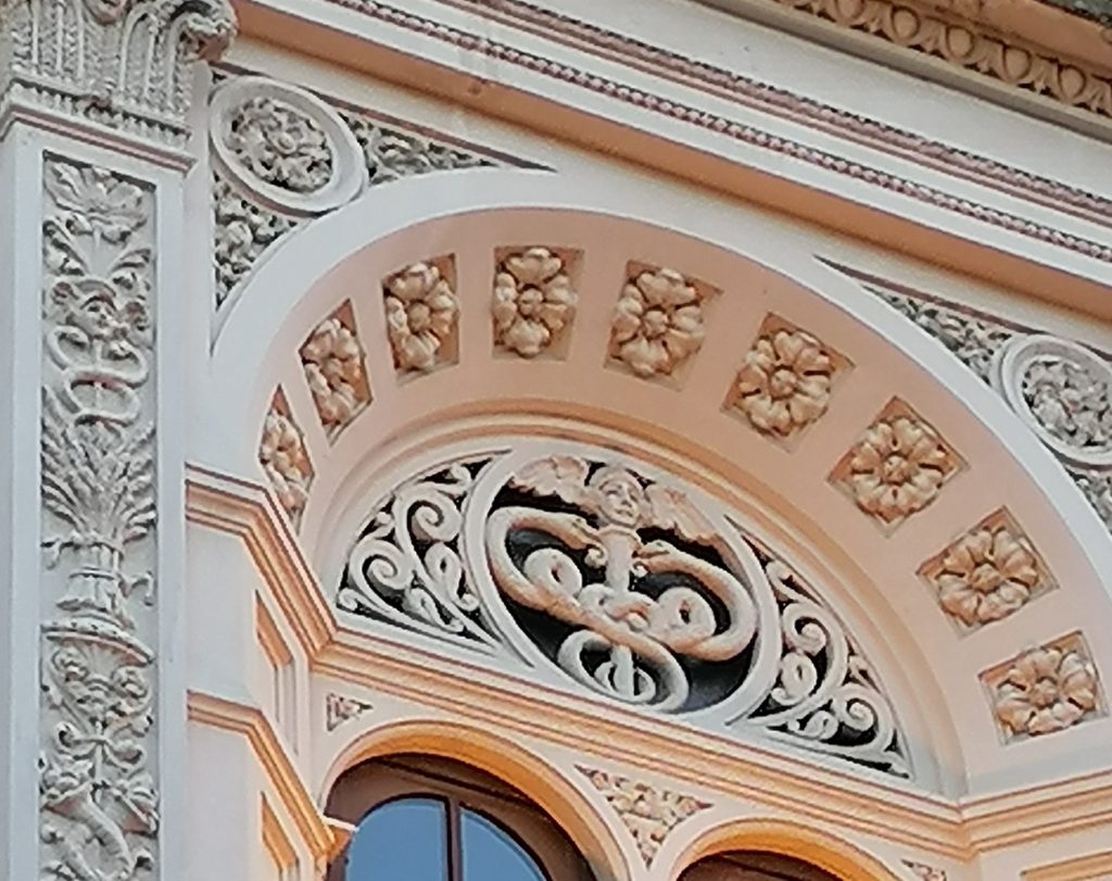 All’esterno, sulla facciata del campanile, si trova l’altorilievo dell’Angelo della Divina Misericordia, portatrice di benessere, simbolo di fertilità e abbondanza. Questo rilievo, con le sue cornucopie simmetriche, rappresenta un’unione armoniosa tra sacro e profano.