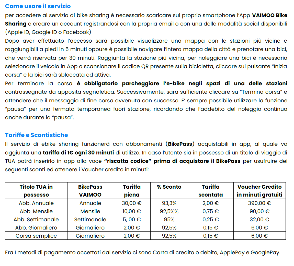 Nel corso dell’ultimo anno TUA ha individuato il partner operativo per il servizio di sharing, Vaimoo, e si appresta a sperimentare il servizio fino al 30 giugno prossimo, con la speranza che esso possa essere ulteriormente prorogato ed avendo cura che le scontistiche sui servizi di sharing risultino sempre più integrate nelle logiche di vendita dei servizi di TPL e che questi servizi siano complementari a quelli tradizionalmente offerti da TUA su gomma e ferro”.