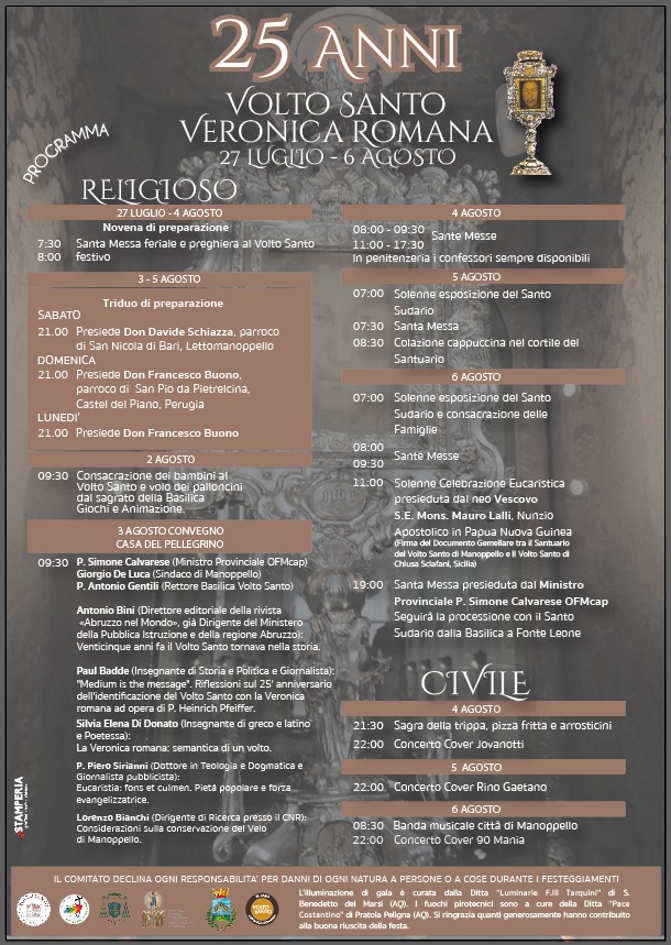 La festa, che parte domani, venerdì 2 agosto e si conclude martedì, sarà anche un’occasione per celebrare, con il convegno di studi “Sotto lo sguardo di Cristo, verso il Giubileo”, i venticinque anni dall’identificazione del Volto Santo di Manoppello con la Veronica Romana.