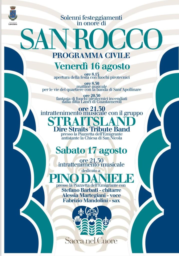 La prima giornata si conclude con il concerto alle 21.30 presso la piazzetta dell’Emigrante, dei Straitsland, tribute band dei Dire Straits. Sabato 17 alle 21.30 ci sarà invece l’intrattenimento musicale con un omaggio a Pino Daniele con Stefano Barbati alla chitarre, Alessia Martegiani alla voce e Fabrizio Mandolinui al sassofono.