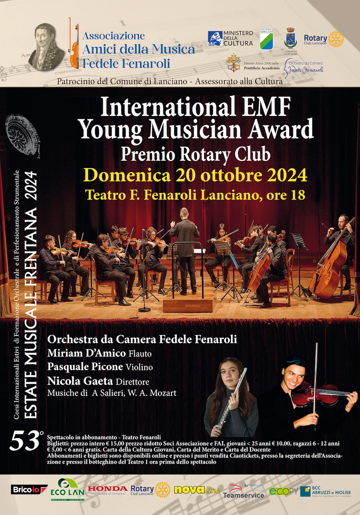 Lanciano- Partirà domenica 20 ottobre la stagione autunno-inverno dell’associazione Amici della Musica – “Fedele Fenaroli”, dopo la ricca parte estiva dell’Estate Musicale Frentana 2024. Ad inaugurare la stagione sarà il concerto dell’International EMF Young Rotary Award – Premio Rotary Club, alle ore 18, al teatro Fedele Fenaroli di Lanciano, con l’Orchestra da Camera “Fedele Fenaroli”, diretta dal giovane Maestro Nicola Gaeta, e i due giovani solisti, vincitori del premio, selezionati attraverso le master class estive dell’Associazione, Miriam D’Amico, flautista di Pescara, e Pasquale Picone, violinista di Caserta. Verranno eseguite musiche di Antonio Salieri e Wolfgang Amadeus Mozart, i due compositori del Settecento, a Vienna, messi qui a confronto.