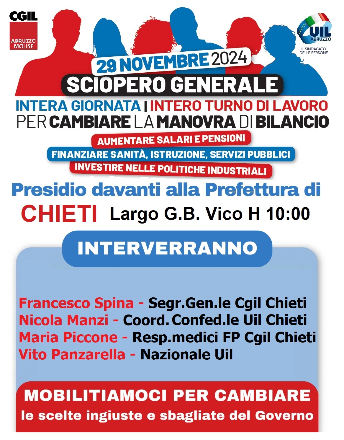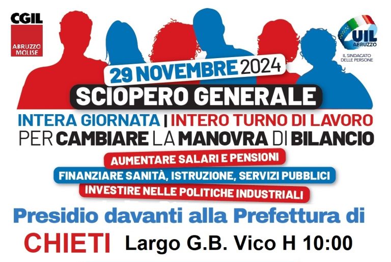 CHIETI – In occasione dello sciopero generale contro la manovra finanziaria del Governo, previsto per il 29 novembre, CGIL e UIL organizzano un presidio a Chieti, in Largo G.B. Vico, con inizio alle ore 10:00.