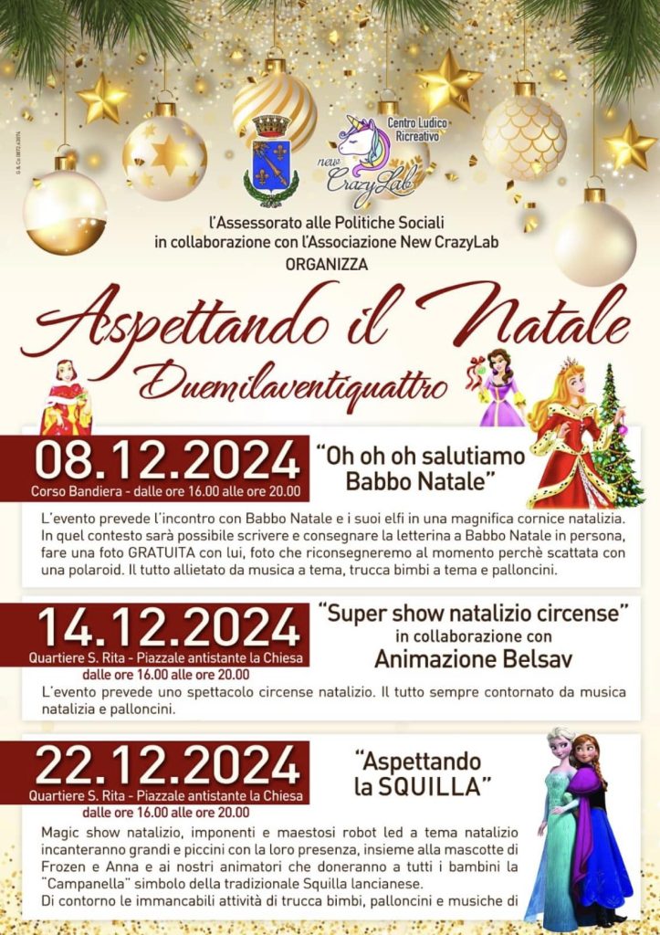 Con il Natale ormai alle porte s’inizia a respirare aria di festa anche a Lanciano. L’Assessorato alle Politiche Sociali in collaborazione con l’associazione New Crazy Lab organizza l’evento “Aspettando il Natale 2024” con tre appuntamenti che dall’8 fino al 22 dicembre accompagneranno grandi e piccoli verso i giorni clou del Natale che, come da tradizione a Lanciano, comincia prima con il rito della Squilla del 23 dicembre.