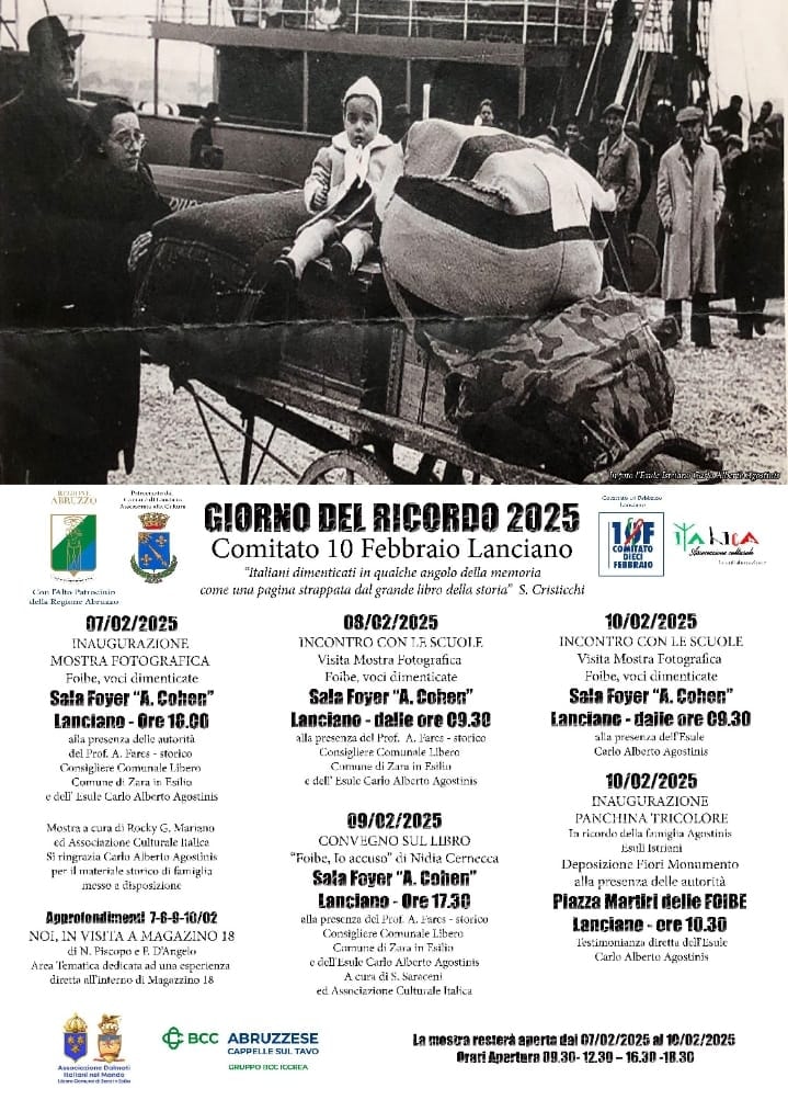 Patrocinati dalla regione Abruzzo e dall’assessorato alla Cultura del Comune di Lanciano saranno quindi numerosi gli eventi in città per rendere viva la memoria di quegli “italiani dimenticati in qualche angolo della memoria, come una pagina strappata dal grande libro della storia” usando le stesse parole con cui il cantautore Simone Cristicchi nel suo brano “Magazzino 18”, descriveva la doppia tragedia di tanti nostri connazionali che, oltre alla violenza ed alla fuga, hanno dovuto subire anche l’onta dell’oblio.