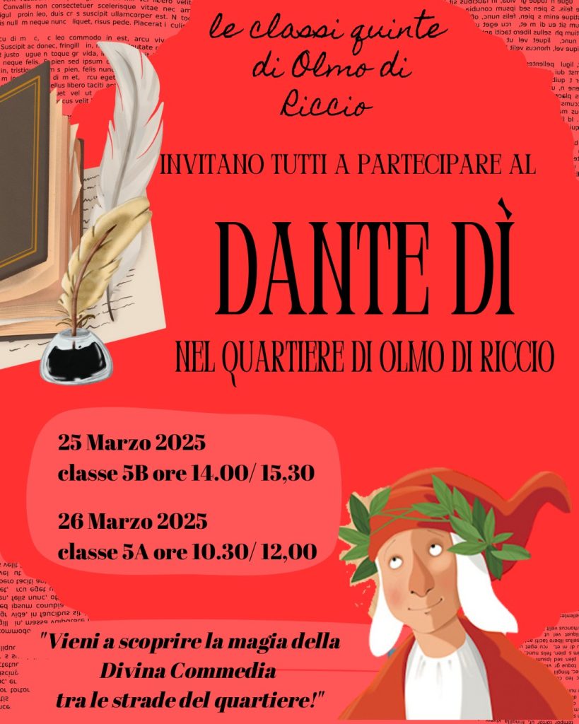 Anche a Lanciano come in tutta la penisola, si è deciso di celebrare il padre della Commedia, con uno speciale evento itinerante. Oggi martedì 25 e domani mercoledì 26 marzo le classi quinte della scuola primaria di Olmo di Riccio con i giovani “Ambasciatori di Dante” porteranno tra le strade del quartiere i versi della Divina Commedia, raccontando la vita e le opere del poeta con letture, storie e piccole lezioni in strada .