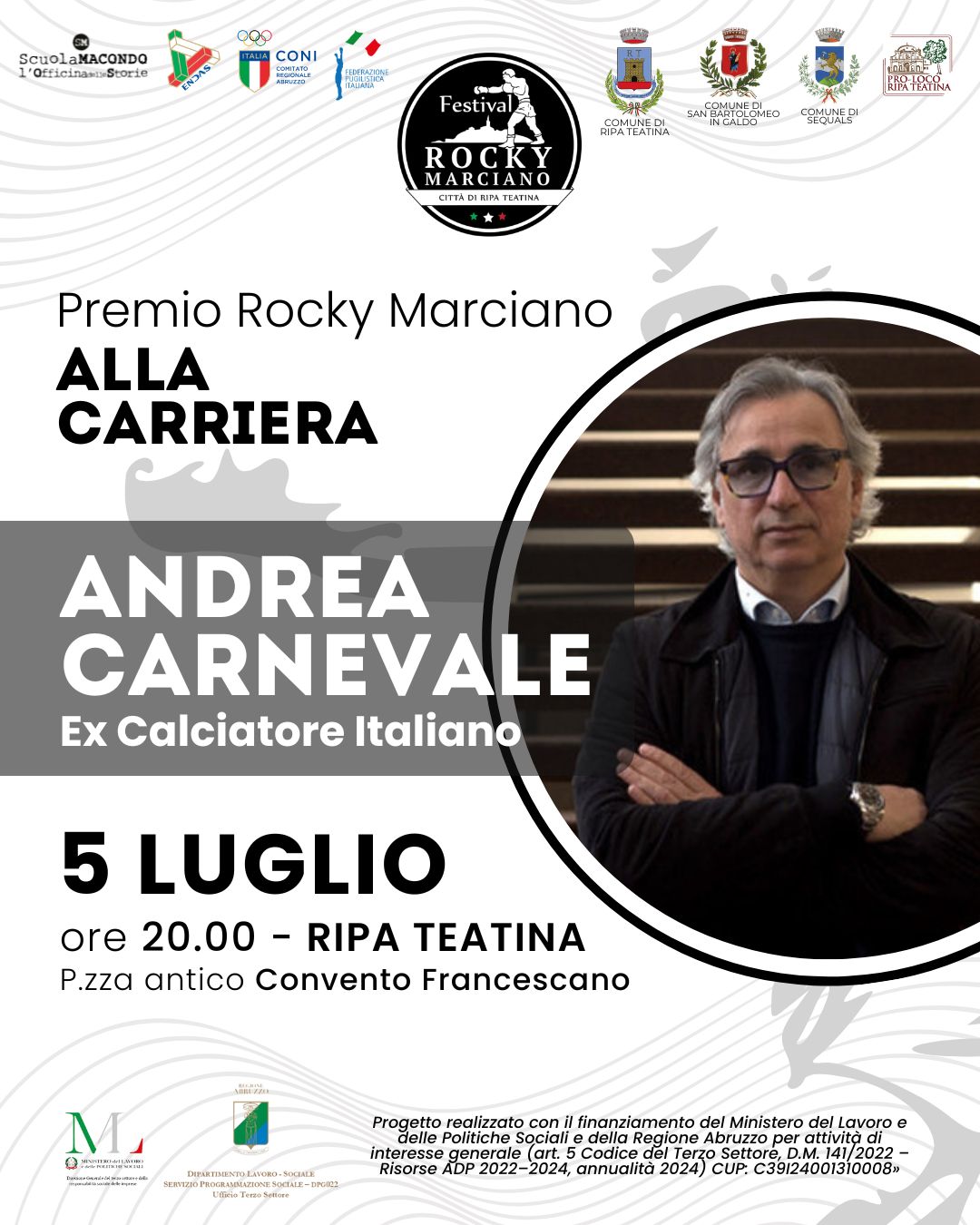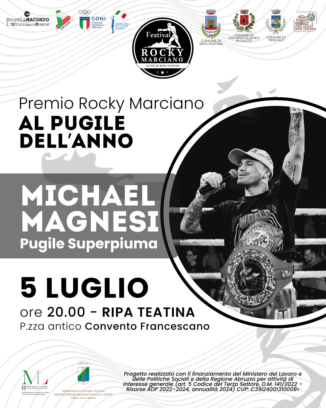 Durante la serata, che vedrà come special guest Maurizio Compagnoni di Sky Sport e Dom Serafini con il libro V volume “I messaggeri d’Abruzzo nel Mondo”, ci saranno momenti dedicati al ricordo di Nino Benvenuti, cittadino onorario di Ripa Teatina, e Rino Tommasi, amico del Borgo dei Campioni e protagonista delle prime edizioni del Premio Rocky Marciano.