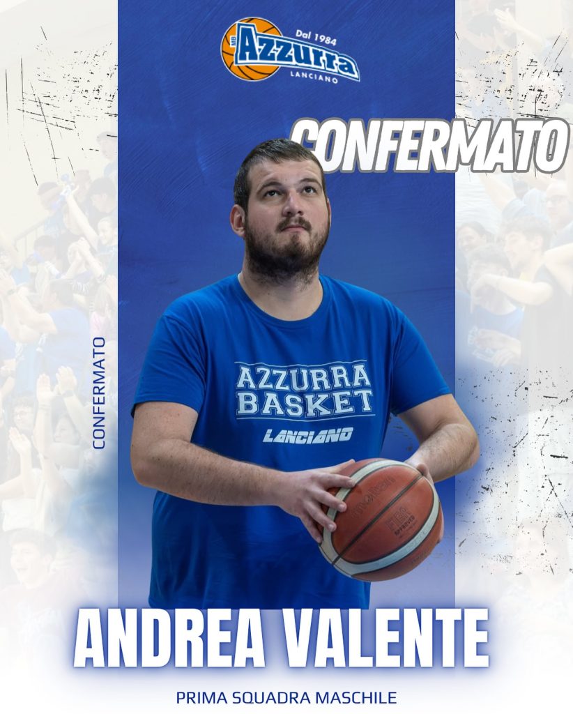 Altra conferma importante è quella del classe 1999, originario di Ortona, Andrea Valente che vestirà ancora la maglia biancozzurra. Andrea nella scorsa stagione si è dimostrato un tassello prezioso sotto le plance, affidabile e capace di mettere in campo solidità e grande senso del gioco. Un ragazzo esemplare che ha sempre dimostrato rispetto per i ruoli e per i compiti assegnati, diventando un punto di riferimento anche nello spogliatoio.