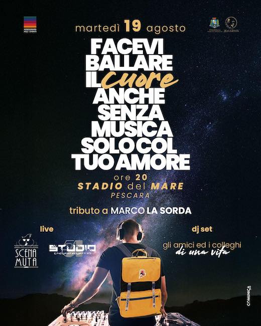 Si terrà domani martedì 19 agosto, dalle ore 20, con un grande evento musicale allo Stadio del Mare la serata in ricordo di Marco La Sorda, il celebre dj pescarese scomparso pochi giorni fa. La serata tributo è organizzata dal Comune di Pescara e dal comitato “Amici di Marco”, con il sostegno dell’assessorato agli Eventi guidato da Alfredo Cremonese, fra i primi a creare e inserire l’evento nella prestigiosa rassegna estiva del We Love Fest.