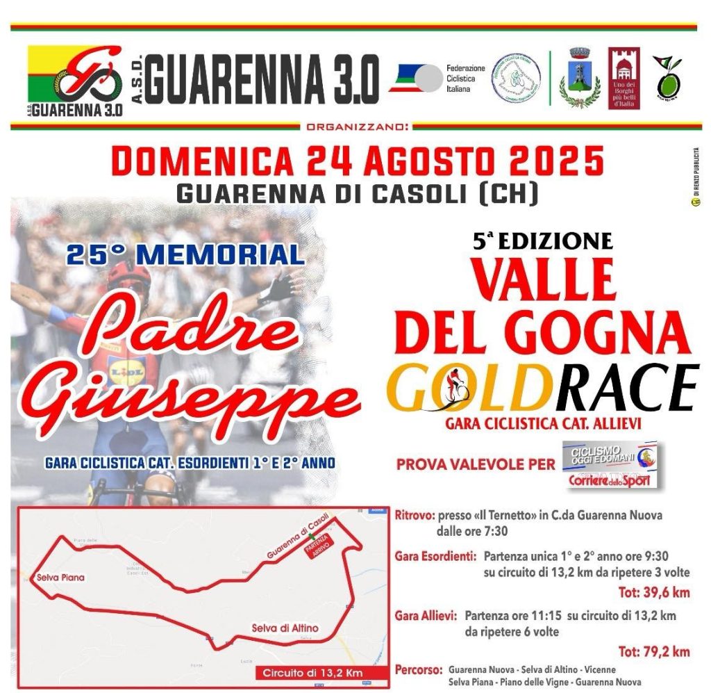 Domenica 24 agosto a Guarenna di Casoli si svolgerà il Memorial Padre Giuseppe e la Valle del Gogna Gold Race, nel solco di una tradizione ormai consolidata. Dal 2021, l’Asd Guarenna 3.0 propone un’intera giornata dedicata a esordienti e allievi, spostata in un’insolita collocazione estiva.