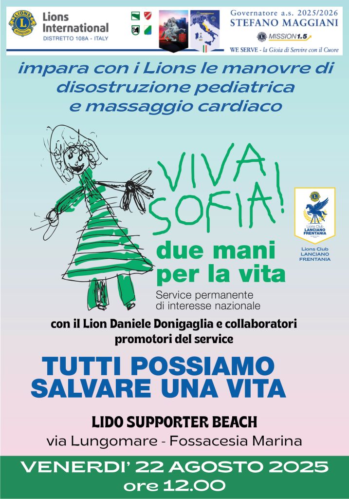 Manovre di disostruzione pediatrica e massaggio cardiaco: sono questi i pilastri del service Viva Sofia. Due mani per la vita che i Lions proporranno venerdì 22 agosto, a partire dalle ore 12.00, presso lo stabilimento balneare Supporter Beach in via Lungomare a Fossacesia Marina.