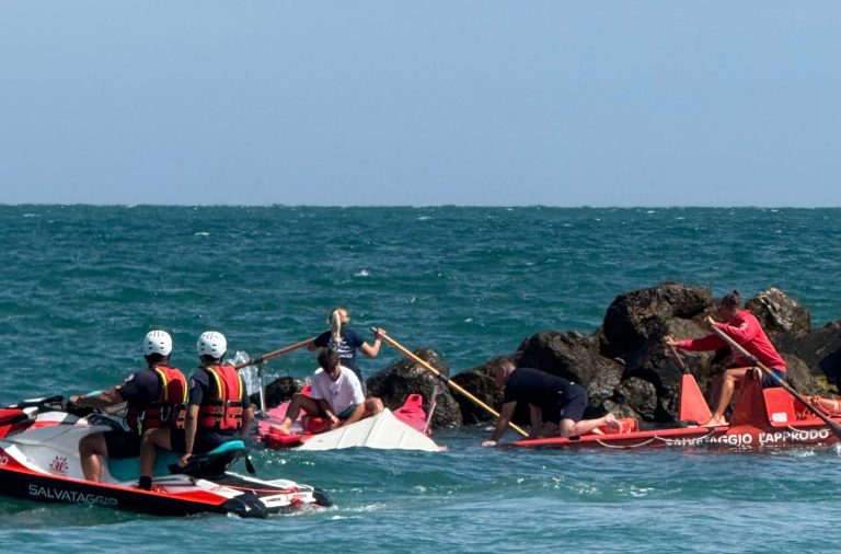 L’operazione non si è conclusa con il salvataggio delle persone: l’imbarcazione rischiava infatti di affondare. È quindi intervenuto anche l’acquascooter della Lifeguard, supportato da un secondo e da un terzo pattino.