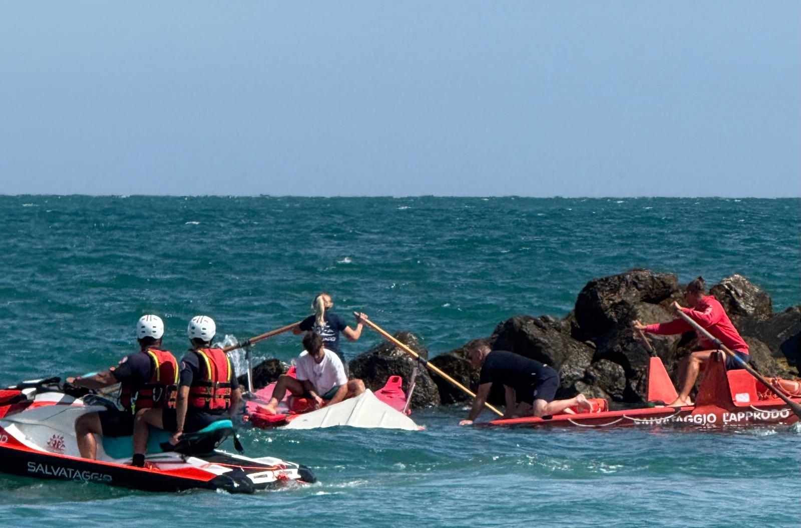 In questa fase sono entrati in azione anche due assistenti bagnanti non in servizio, Samuele e Aurora Di Santo, che hanno collaborato con i membri dell’equipaggio Luigi Sebastiani e Angelo Migliaccio. Con notevole impegno e difficoltà, a causa del mare mosso e della vicinanza delle scogliere, la barca è stata disincagliata, assicurata con una cima e infine trainata a riva, dove i bagnanti presenti hanno aiutato a rigirarla e a metterla in sicurezza.