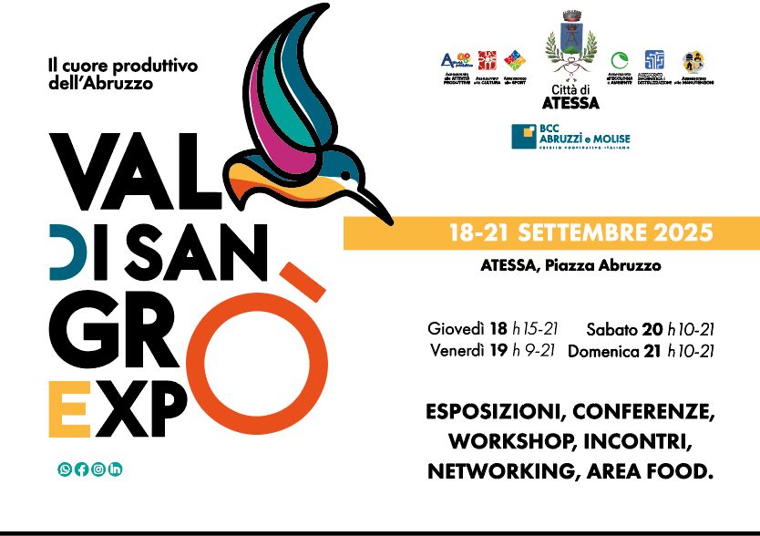 Dal 18 al 21 settembre si svolgerà la seconda edizione del “Val di Sangro Expo” a Atessa, piazza Abruzzo. Oltre 200 le Aziende negli oltre 15.000 mq dell’area espositiva. L’ingresso all’Expo e a tutte le iniziative è libero.