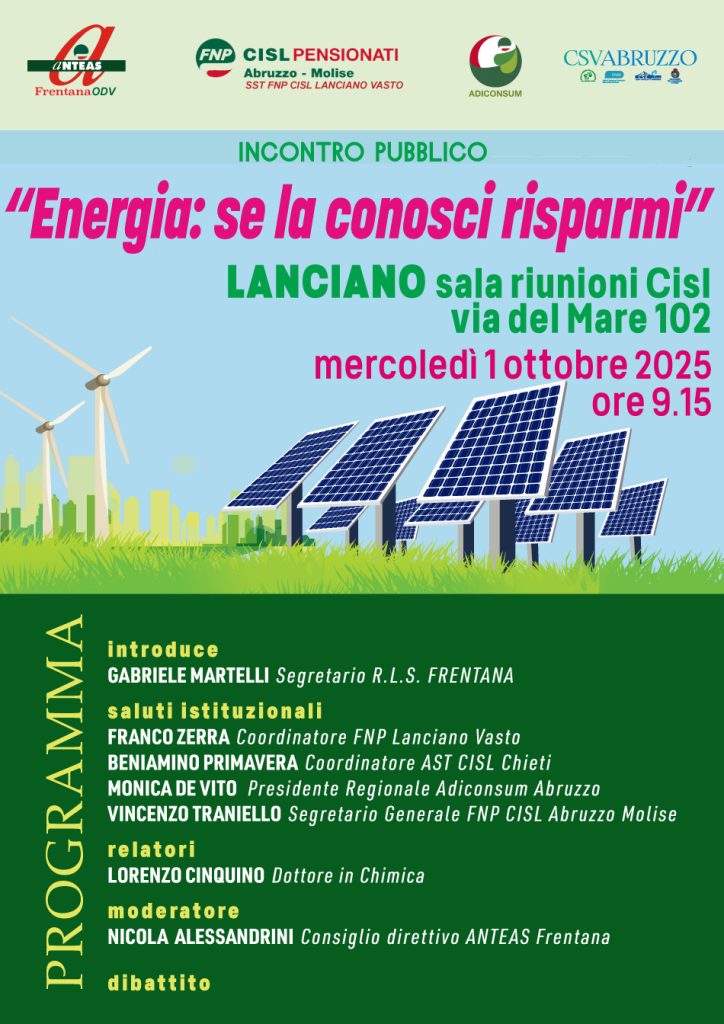“Energia: se la conosci risparmi” è il titolo dell’incontro pubblico che si sta tenendo oggi,mercoledì 1 ottobre 2025, a partire dalle ore 9.15, presso la sala riunioni CISL in via del Mare 102 a Lanciano.