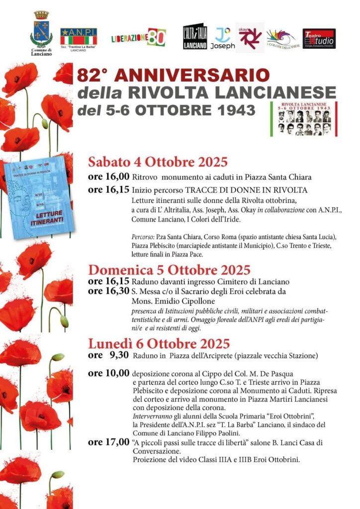 Proseguono oggi, lunedì 6 ottobre 2025, le celebrazioni per l’82º anniversario della Rivolta Lancianese del 5-6 ottobre 1943, organizzate dal Comune di Lanciano e dall’A.N.P.I. “T. La Barba”.