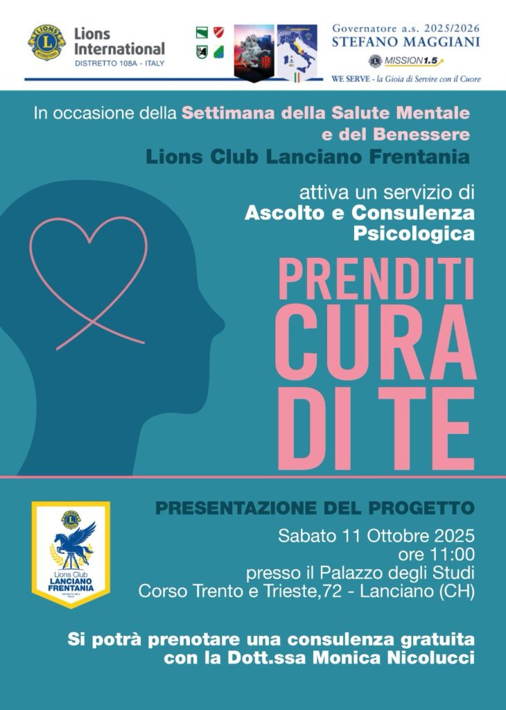 Un’azione concreta del Lions Club Lanciano Frentania per promuovere il benessere mentale, offrendo ascolto, supporto e prevenzione attraverso un servizio professionale che mette al centro la persona.“Il Lions Club Lanciano Frentania, con questa iniziativa, ribadisce il suo impegno a favore della comunità, mettendo in pratica i principi del lionismo, che si fondano sul volontariato, la solidarietà ed il servizio verso prossimo – ha concluso Codagnone – siamo convinti che, con il supporto delle istituzioni e della comunità, possiamo fare la differenza nella vita delle persone, contribuendo a costruire una società più sana, inclusiva e consapevole”
