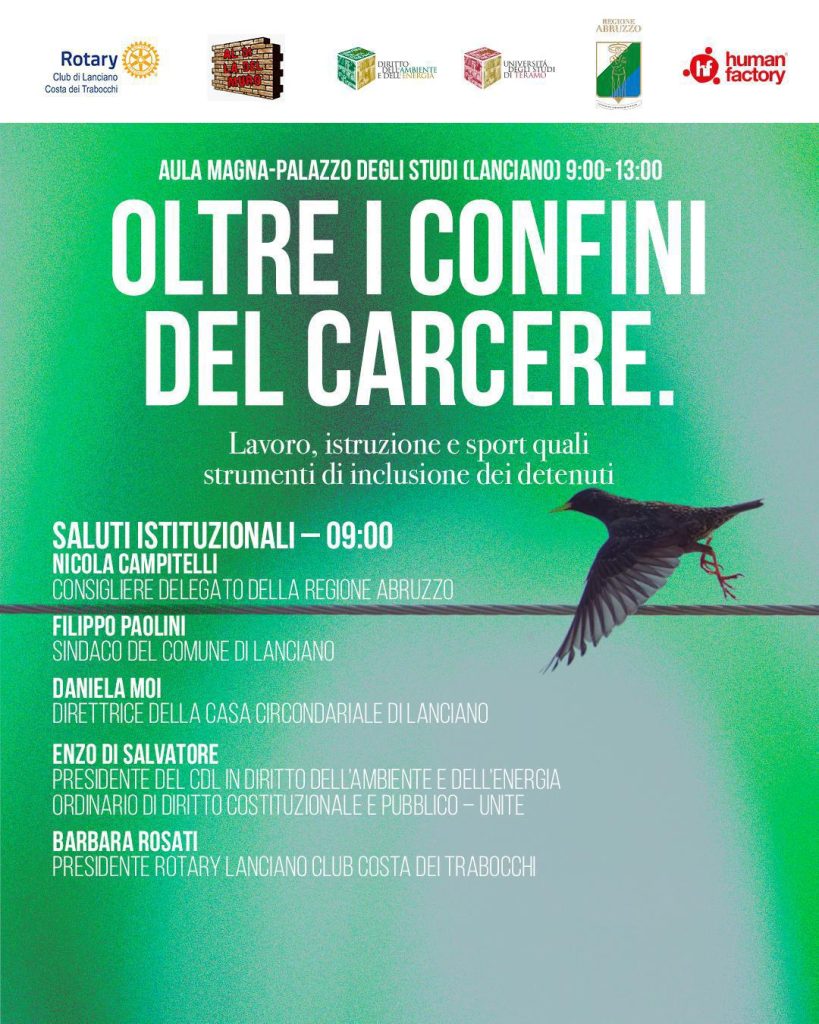 Giovedì 16 ottobre dalle ore 9.00 presso l’Aula Magna del Palazzo degli Studi di Lanciano (CH), si terrà il Convegno dal titolo “Oltre i confini del carcere. Lavoro, istruzione e sport quali strumenti di inclusione dei detenuti”, organizzato dal Rotary Club Lanciano Costa dei Trabocchi in collaborazione con l’Università di Teramo (Corso di Laurea in Diritto dell’Ambiente e dell’Energia), la Casa Circondariale di Lanciano, l’I.P.A Abruzzo (Progetto Al di là del muro) e l’Ente di formazione Human Factory e volto a evidenziare il valore del lavoro, dello sport e dell’istruzione nel percorso riabilitativo delle persone detenute.