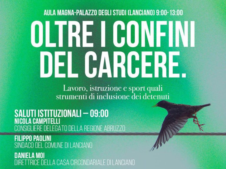Giovedì 16 ottobre dalle ore 9.00 presso l’Aula Magna del Palazzo degli Studi di Lanciano (CH), si terrà il Convegno dal titolo “Oltre i confini del carcere. Lavoro, istruzione e sport quali strumenti di inclusione dei detenuti”, organizzato dal Rotary Club Lanciano Costa dei Trabocchi in collaborazione con l’Università di Teramo (Corso di Laurea in Diritto dell’Ambiente e dell’Energia), la Casa Circondariale di Lanciano, l’I.P.A Abruzzo (Progetto Al di là del muro) e l’Ente di formazione Human Factory e volto a evidenziare il valore del lavoro, dello sport e dell’istruzione nel percorso riabilitativo delle persone detenute.