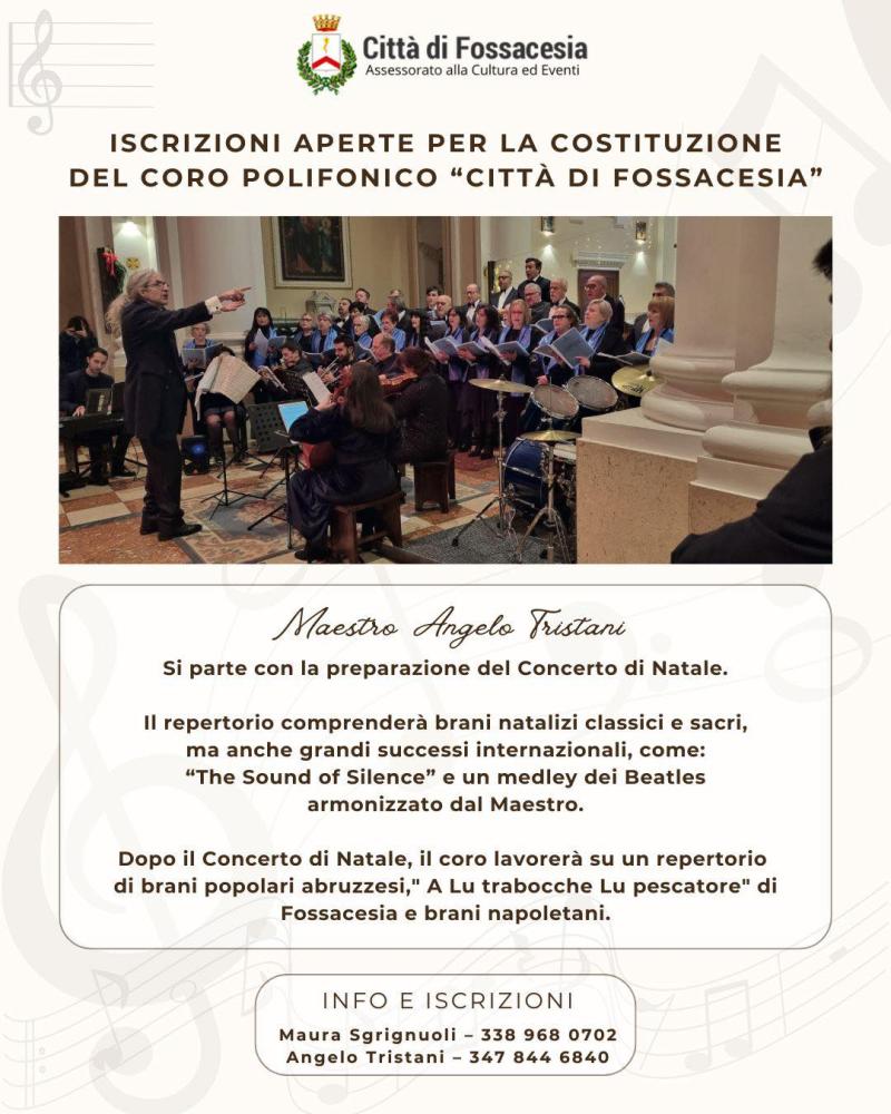 L’amministrazione comunale di Fossacesia, nell’ambito delle attività culturali e di coesione sociale, ha avviato la costituzione del Coro Polifonico “Città di Fossacesia”, un progetto volto a ricostruire una tradizione musicale importante per la città. Il coro sarà guidato dal Maestro Angelo Tristani, che ha generosamente offerto la propria disponibilità e competenza per dare nuovo slancio alla vita culturale del territorio, mettendo a frutto anche la sua esperienza nella direzione di cori folkloristici.