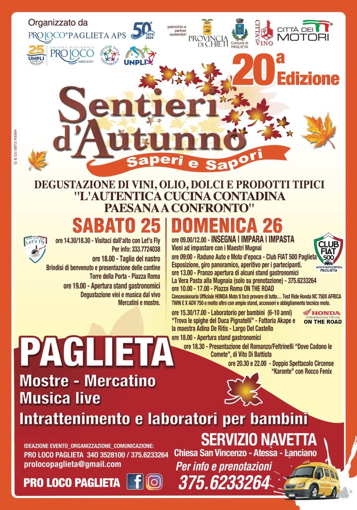 Per onorare al meglio la ventesima edizione dei Sentieri d’Autunno, la Pro Loco Paglieta APS ha messo in campo un programma coi fiocchi.