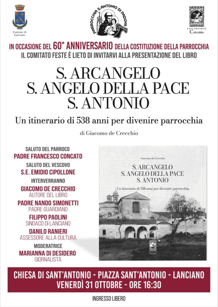 Sessant’anni di vita parrocchiale e oltre cinque secoli di storia spirituale racchiusi in un volume. Venerdì 31 ottobre, alle ore 16.30, nella Chiesa di Sant’Antonio di Padova a Lanciano, si terrà la presentazione del libro “S. Arcangelo, S. Angelo della Pace, S. Antonio – Un itinerario di 538 anni per divenire parrocchia”, scritto da Giacomo De Crecchio e pubblicato da Casa Editrice Carabba.
